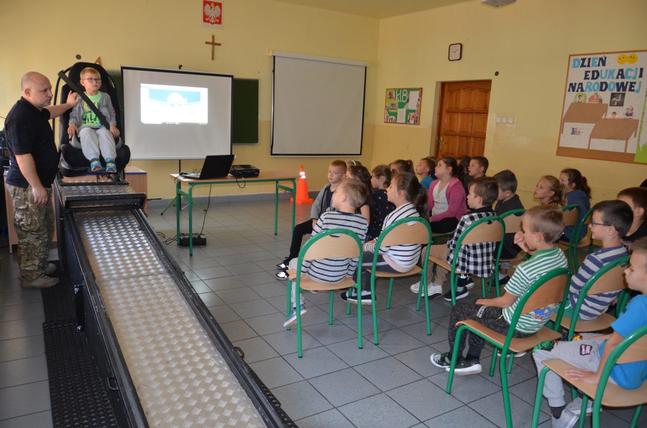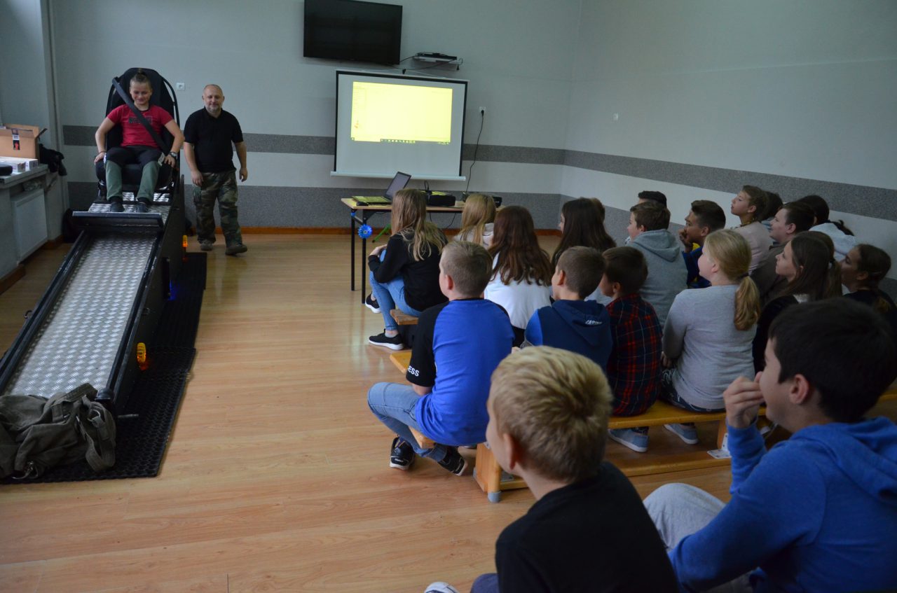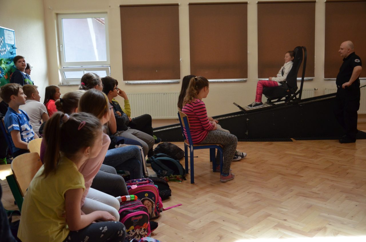 Podczas realizacji zajęć edukacyjnych wykorzystamy został Symulator Zderzenia - miał on uświadomić uczestnikom zajęć w sposób praktyczny jak ważne jest zapinanie pasów bezpieczeństwa podczas jazdy pojazdem. Symulator, który był wykorzystany do prowadzenia zajęć imituje sytuację zderzenia pojazdu jadącego z prędkością około 10 km/h z nieruchomą przeszkodą. Urządzenie składa się z trzech części. Dwie z nich stanowią równię pochyłą po której zjeżdża platforma z fotelem wyposażonym w pasy bezpieczeństwa. Część jezdna porusza się po równi z osobą przypiętą do fotela, po czym gwałtownie zatrzymuje się. Sytuacja taka sprawia, że pasażer siedzący w fotelu czuje szarpnięcie, lecz zapięte pasy bezpieczeństwa skutecznie go zabezpieczają. Każdy uczeń, który wyraził na to zgodę przeżył „zderzenie" na żywo w bardzo bezpiecznych warunkach, poznał reakcję ciała w czasie nagłego zatrzymania z niewielkiej prędkości – dzięki temu wzrosła świadomość uczestników zajęć w sprawie konieczności używania pasów bezpieczeństwa jako zabezpieczenia przed niepożądanymi skutkami zderzenia pojazdu mechanicznego (np. samochodu). Wzrosła również świadomość niebezpieczeństwa wynikającego z nagłego zatrzymania pojazdu i wiedza, że jakiekolwiek zderzenie nie pozostaje obojętne dla pasażerów oraz, że zwiększenie prędkości pojazdu, powoduje większe skutki w czasie jego nagłego zatrzymania.
