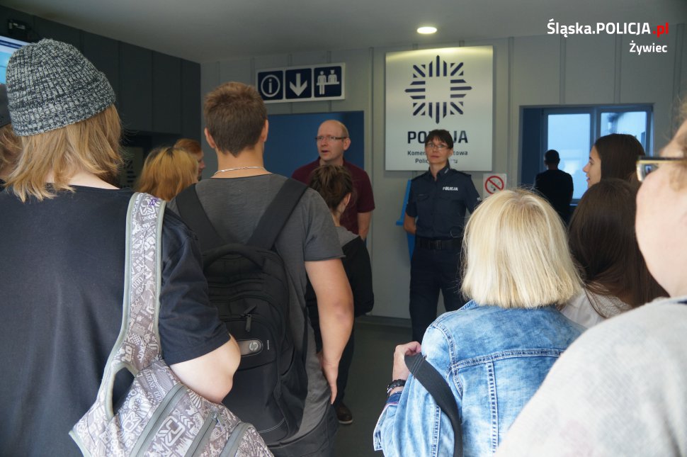 Trzy grupy młodzieży polskiej i szwedzkiej miały możliwość zwiedzenia budynku żywieckiej policji. Młodzi ludzie zapoznali się ze specyfiką pracy dyżurnego, następnie zwiedzili pomieszczenia dla osób zatrzymanych. Bardzo interesującym punktem odwiedzin był pokaz zabezpieczenia śladów, przeprowadzony przez technika kryminalistyki. Następnie w sali narad policjanci zaprezentowali młodzieży sprzęt, wykorzystywany w codziennej służbie przez polską policję oraz opowiedzieli o licznych akcjach i działaniach profilaktycznych, które prowadzą. Dużo emocji wśród szwedzkiej młodzieży wzbudziły, wykorzystywane do pracy profilaktycznej przez żywieckich stróżów prawa, alko- i narkogoogle. Przy okazji policjanci przypomnieli młodzieży o Europejskim Dniu Bez Ofiar Śmiertelnych na drogach, który obchodzony będzie 21 września oraz zaprezentowali szwedzki oraz polski spot, promujący to wydarzenie. Na zakończenie wizyty każdy uczestnik mógł wsiąść do policyjnego radiowozu oraz zobaczyć pokaz wyszkolenia policyjnego psa.
