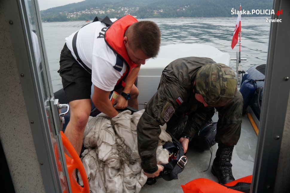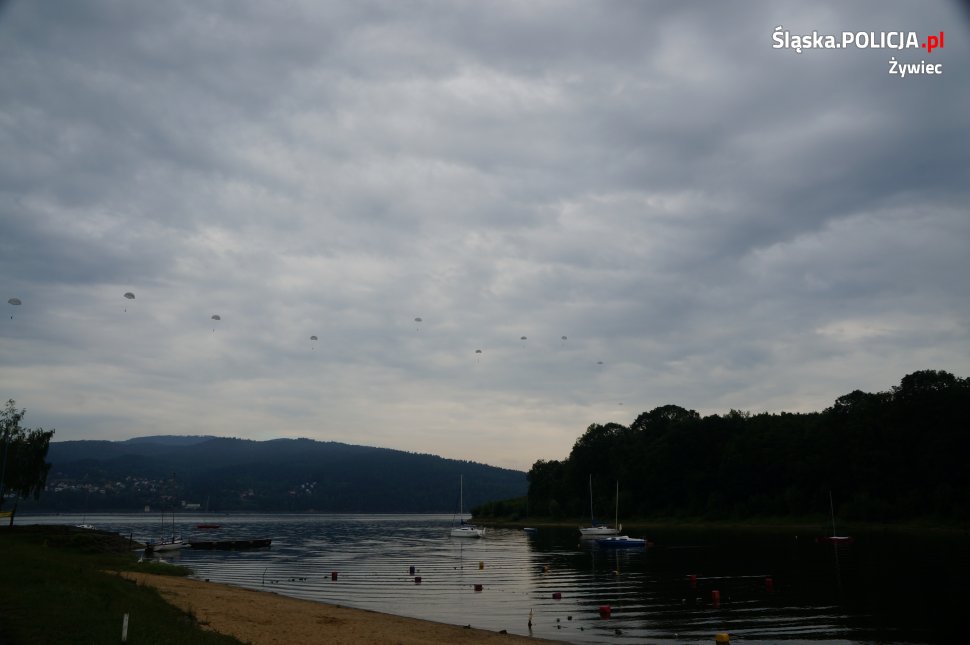 Policjanci z sezonowego ogniwa wodnego, działającego przy Komisariacie Policji w Łodygowicach, dbali o bezpieczeństwo żołnierzy, którzy nad Jeziorem Żywieckim przeprowadzali ćwiczenia. Manewry polegały na skokach ze spadochronem do wody. Żołnierze wojskowym samolotem startowali z góry Żar, a następnie wyskakiwali z niego nad wodami jeziora. Ćwiczenia takie odbywają się już od kilku lat. Żołnierze na miejsce manewrów wybierają wody jeziora żywieckiego z uwagi na jego rozległość oraz doskonałą współpracę z policyjnymi motorowodniakami, woprowcami oraz strażakami, którzy rokrocznie dbają o bezpieczeństwo żołnierzy. Zadaniem policyjnych motorowodniaków jest podjęcie z wody żołnierzy wraz ze sprzętem oraz bezpieczne przetransportowanie ich na brzeg. Ćwiczenia zostały zorganizowane przez dowództwo 18 Bielskiego Batalionu Powietrznodesantowego z Bielska-Białej. Wzięło w nich udział kilkudziesięciu żołnierzy. Dzięki sprawnej współpracy, ćwiczenia przebiegły bezpiecznie.