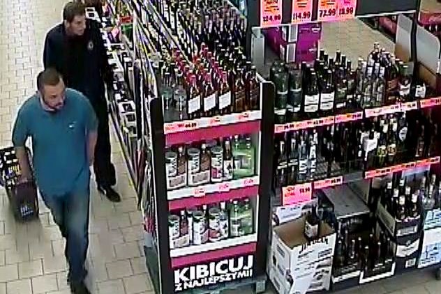 Widoczni na zdjęciu mężczyźni ukradli alkohol o wartości blisko 1300 zł. Podejrzewani o kradzież dwukrotnie kradli przedmioty ze sklepu. Najpierw w dniu 30 czerwca o godzinie 11.30 , a następnie 11 lipca o godz. 9.30.