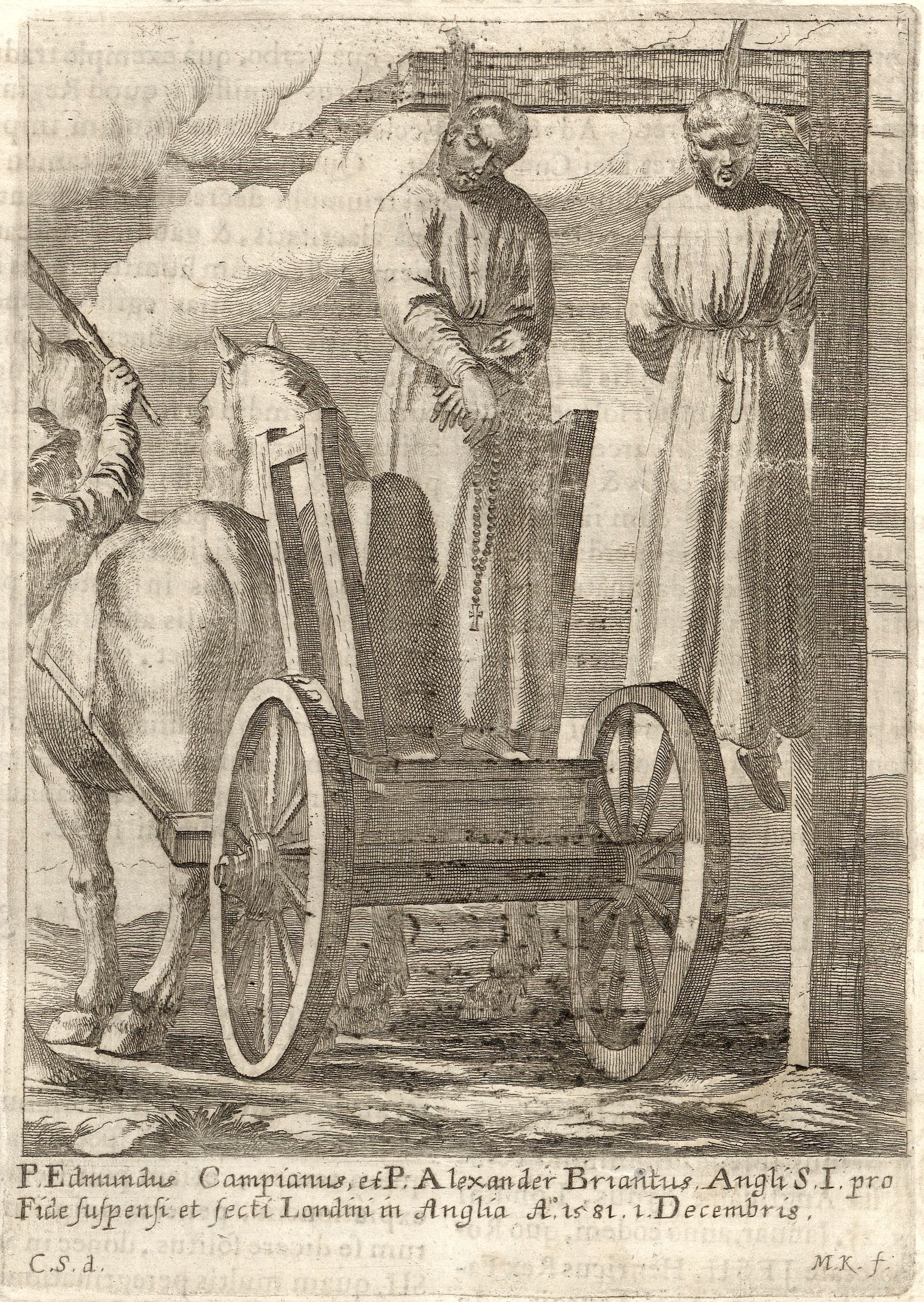 - Scena śmierci Edmunda Campiona zilustrowana miedziorytem Melchiora Küsela (1626–1684), pochodzącym z dzieła Matěja Tannera (1630–1692), Societais Jesu usque ad Sanguinis et vitae profusionem militians... wydanego w 1675 roku w Pradze. Zasądzoną dla Edmunda Campiona karę śmierci przez powieszenie, otwarcie wnętrzności i poćwiartowanie wykonanao 1 grudnia 1581 roku Wraz z nim śmierć poniósł widoczny na ilustracji Aleksander Briant (1556–1581) i Rudolf Sherwin (ok. 1550–1581).