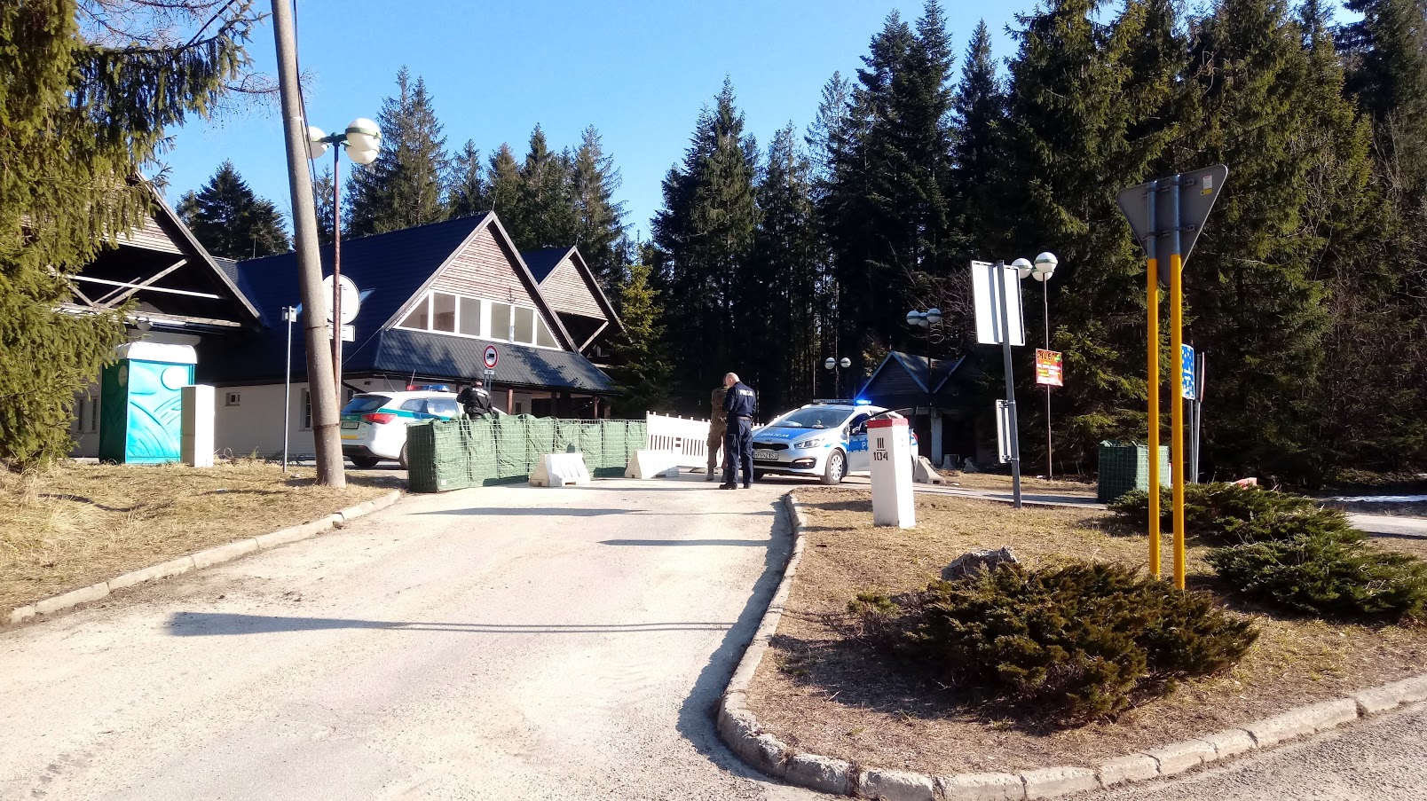 Możliwości wolnego przejazdu przez przejście graniczne graniczne w Korbielowie Glinne strzegą nie tylko barierki, ale też słowaccy i polscy mundurowi. Po polskiej stronie dziś był to jeden policjant i jeden wojskowy. Samochody stały z uruchomionymi sygnałami świetlnymi, czyli popularnymi kogutami. Ruch samochodowy w okolicy jest znikomy.