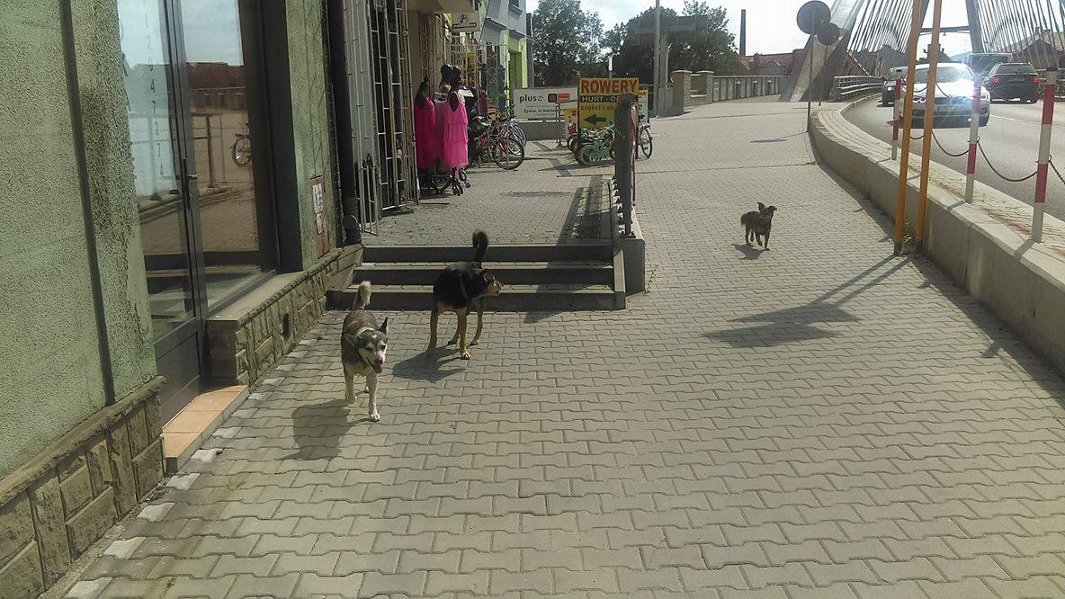 Trzy być może bezpańskie psy, choć z obrożami, błąkają się, a czasem zalegują w cieniu, przy rondzie obok Mostu Solnego. Może ktoś rozpoznaje, zna właściciela, wystawi wodę....