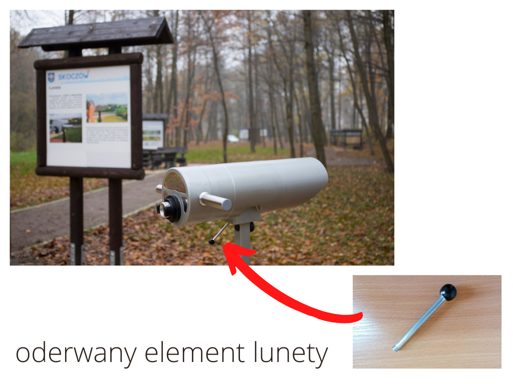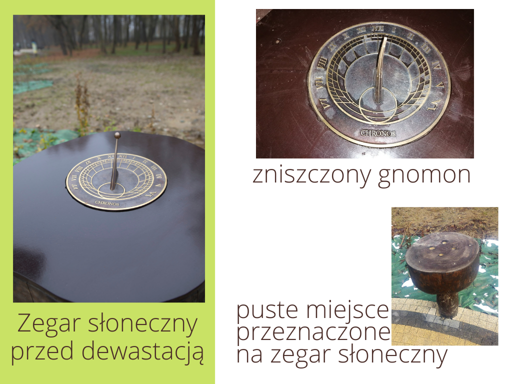 "Luneta do obserwacji ptaków jest uszkodzona – teraz nie można nią płynnie obracać. Zegar słoneczny jest zdemontowany, ponieważ został zniszczony (ktoś wygiął gnomon, a górna część została oderwana!) – po naprawie wróci na swoje miejsce, ale na chwilę obecną można o nim tylko poczytać. Pozostało jeszcze kilka tablic, które mają się pojawić w parku, a część sprzętów jest już zniszczona – o niektórych dewastacjach nawet nie wiecie, ponieważ pracownicy Miejskiego Zarządu Dróg naprawili szkody. Wandale rozpalili ognisko na ławce! To też naprawi MZD.