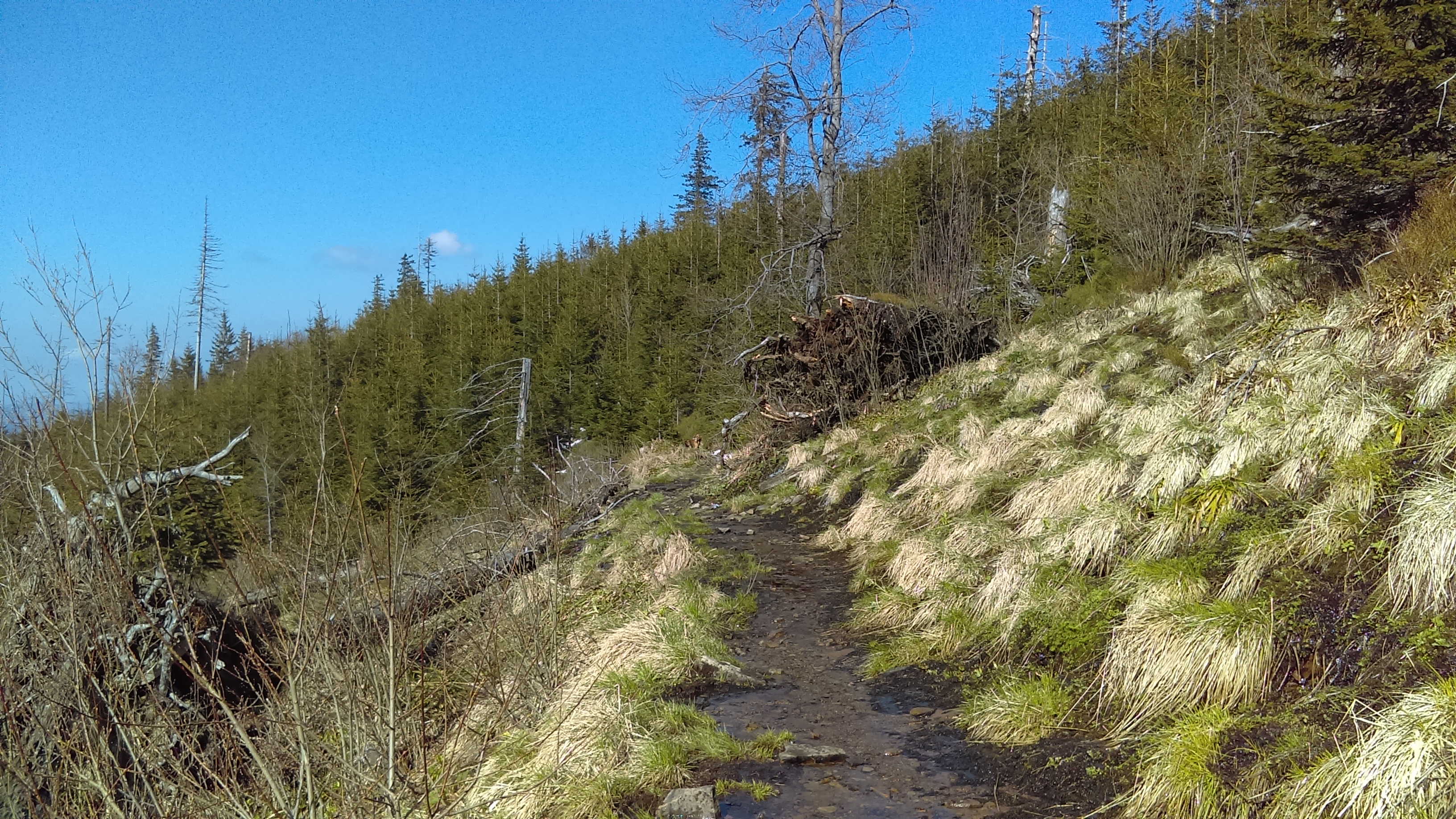 Trasa czerwona z Przełęczy Krowiarki jest zgoła odmienna. Krótsza, zajmuje ok. 2,5 godziny. Wymaga też dojazdu na Krowiarki. Można za to, wędrując tym szlakiem, uświadczyć znacznie więcej widoków na Babią Górę lub stronę Tatr.